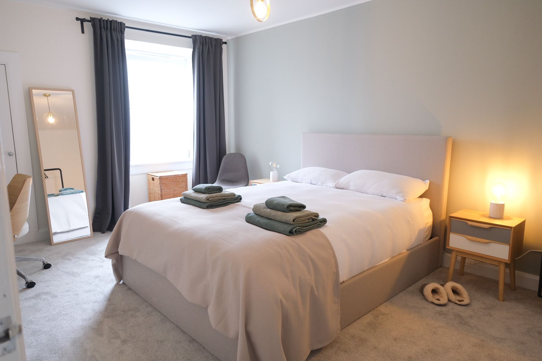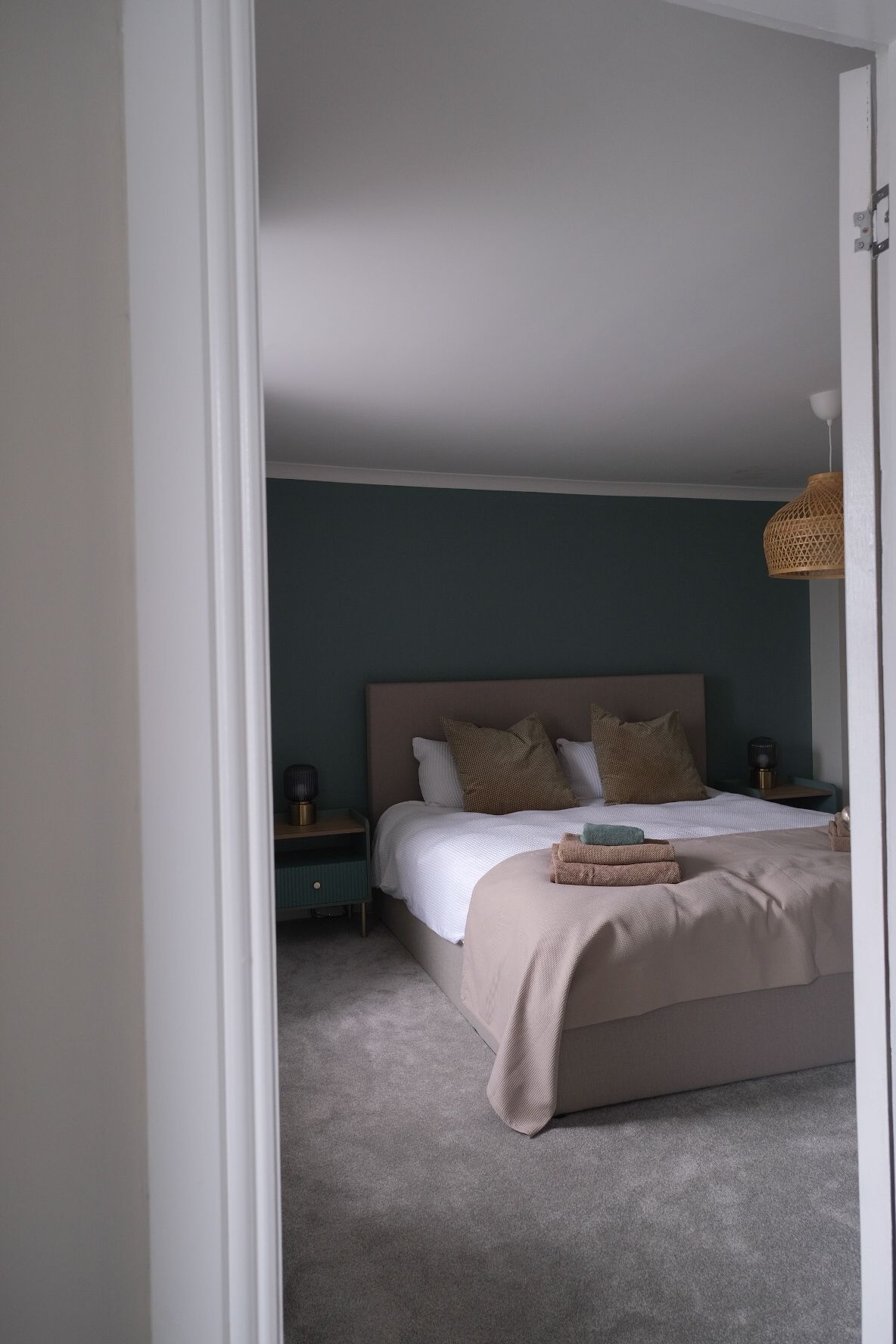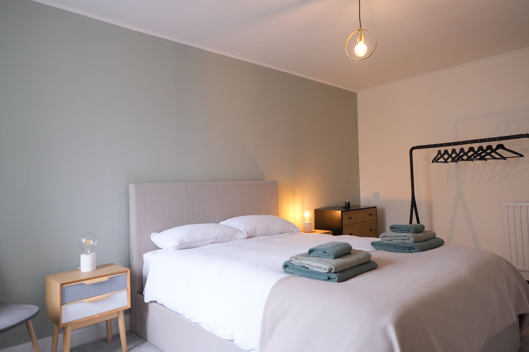 : This bedroom has a king size bed, ample space for clothes storage, a cosy fitted carpet and easy access to the kitchen and stairs to the bathroom.