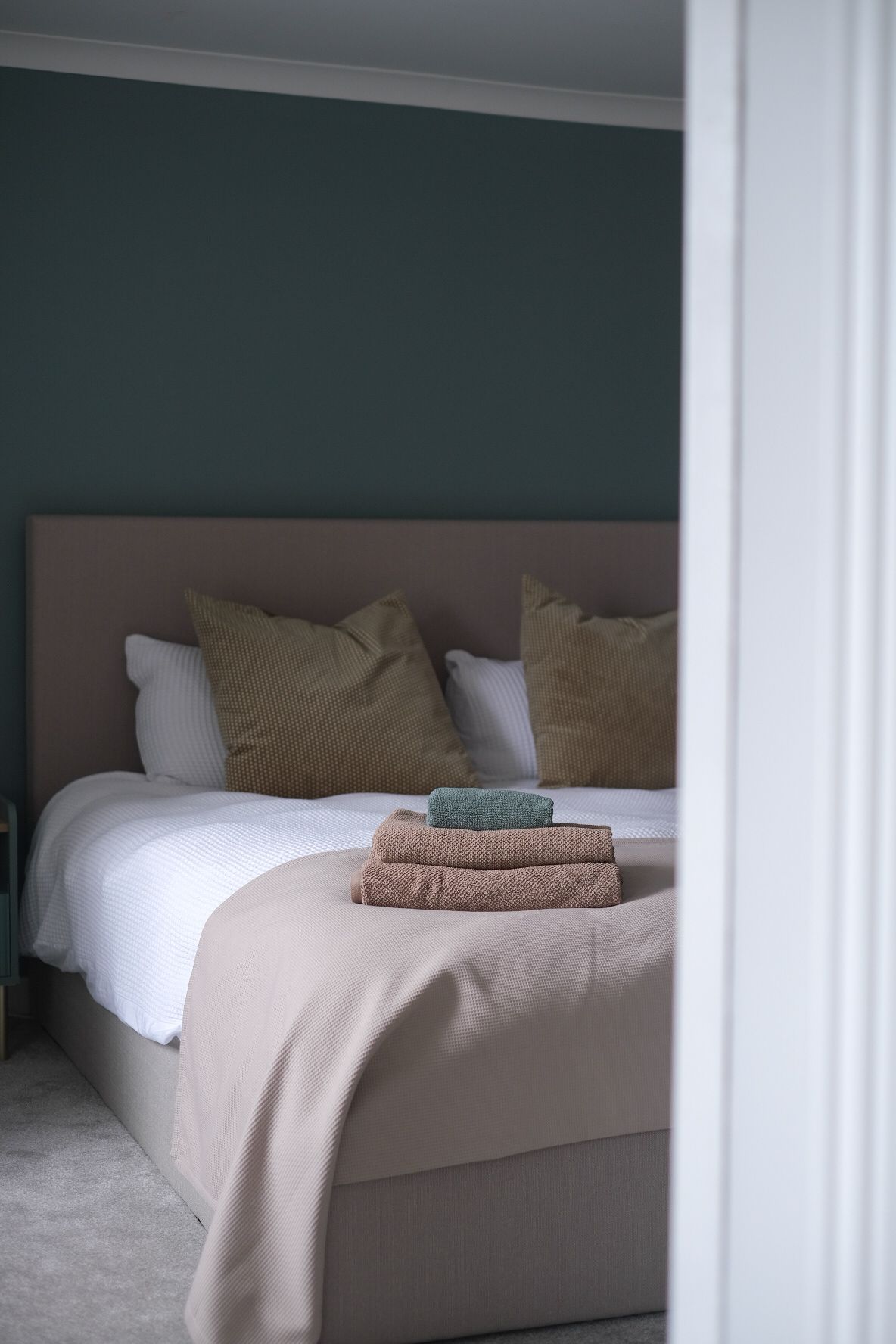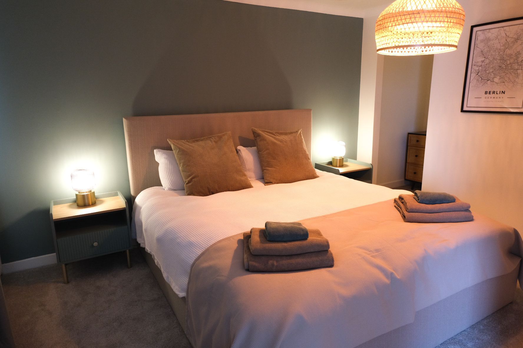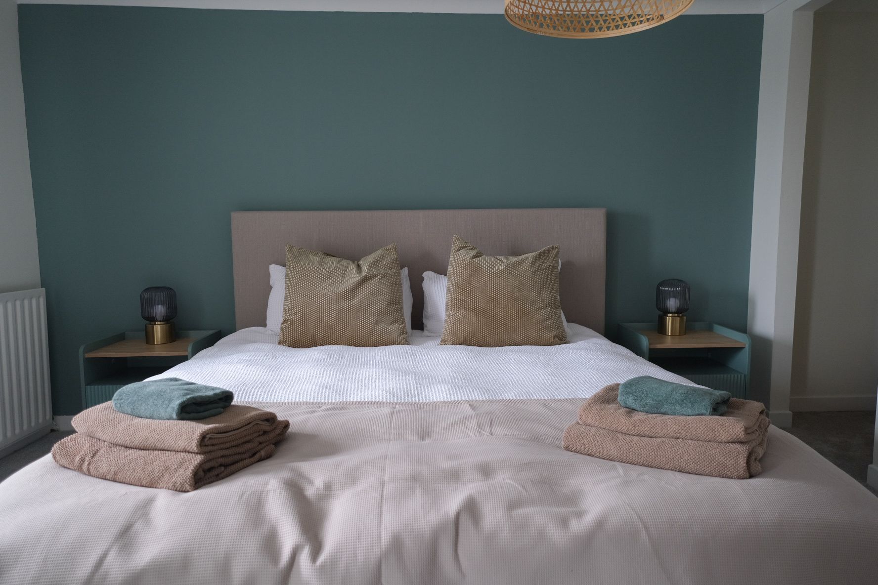 : This bedroom has a king size bed, ample space for clothes storage, a cosy fitted carpet and easy access to the kitchen and stairs to the bathroom.