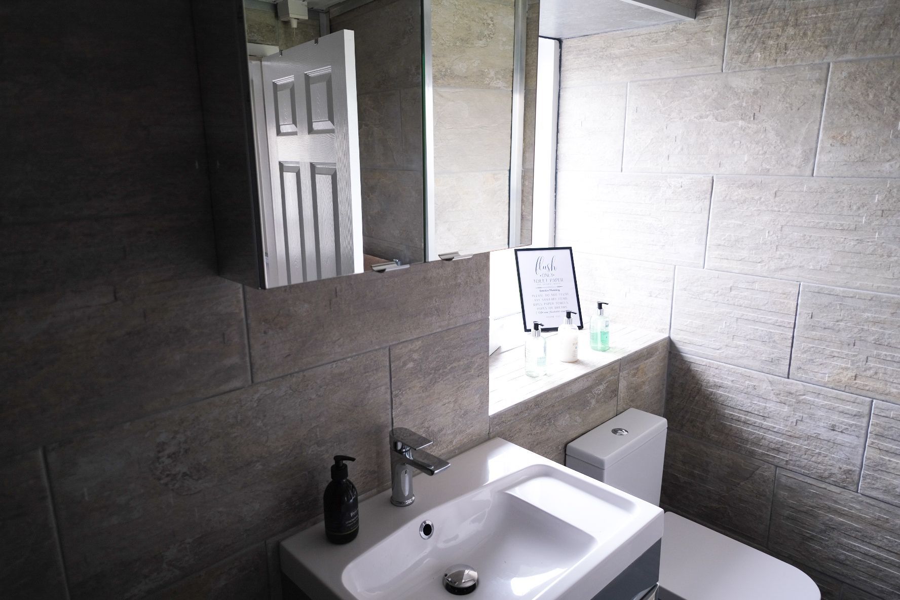 Family bathroom : This modern family bathroom is equipped with a bath and shower, toilet and sink and plenty of storage for your essentials.