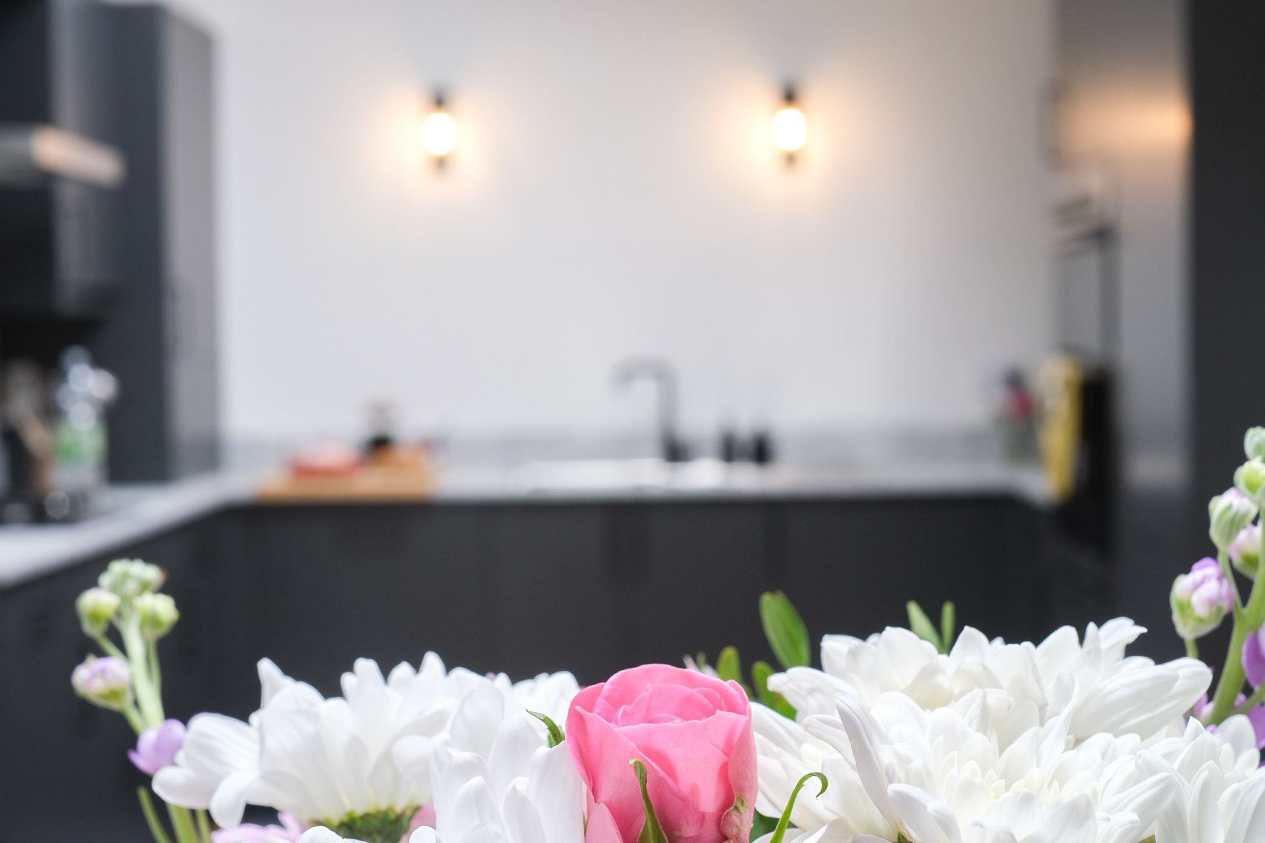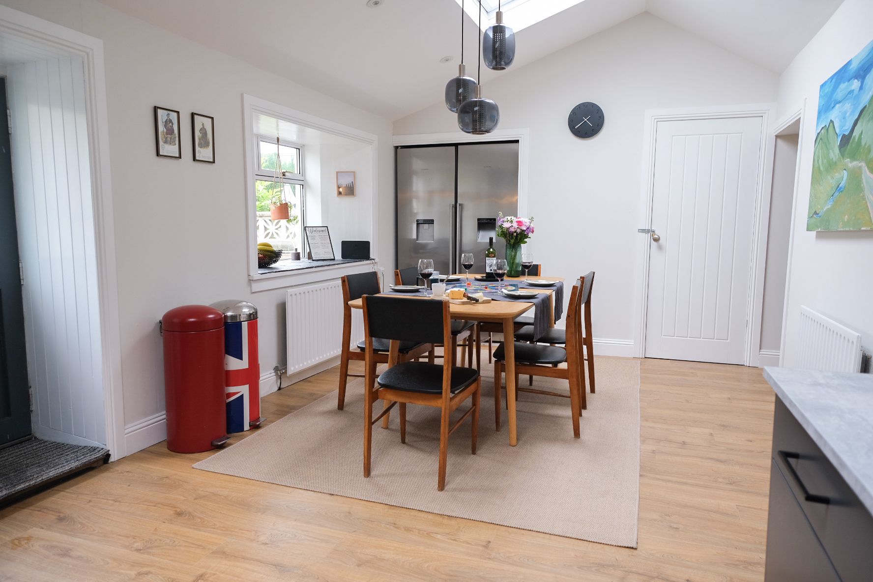 Kitchen : A spacious and light space with fully equipped, modern kitchen and large American style fridge / freezer. The kitchen features a dining area which can seat up to 10 people. The perfect place to cook, socialise and enjoy.